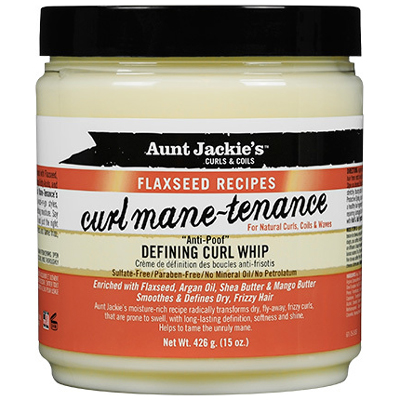 Aunt Jackie's Flaxseed Recipes Curl Mane Tenance Defining Curl Whip. Superior curl definition in a lightweight formula! Say goodbye to poofy, fly away hair. Lightweight Argan Oil and just the right amount of Shea Butter help to soften curls, prevent dryness and tame frizz, without weighing hair down. Enhanced with Flaxseed, nature??s nourishing super supplement that is rich in Omega Fatty Acids and aids in the prevention of thinning & shedding, Curl Mane-Tenance??s water-based hydration is great for 1b ? 4b textures, wash-n-go styles, protective styling, and any hair type in need of long lasting moisture.