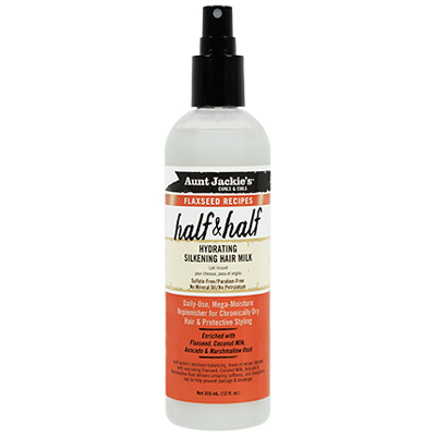 Aunt Jackie's Flaxseed Recipes Half&Half Hydrating Silkening Hairmilk. Refresh dry, thirsty natural hair with Aunt Jackie??s new Flaxseed hair milk recipe. Formulated with nourishing Coconut Milk, Avocado and Marshmallow Root, this hydrating remedy not only moisturizes, but helps detangle and soften. Rich in Omega fatty acids, Flaxseed is widely used to help prevent thinning & shedding, and for improving hair??s health, overall. Go ahead??give your hair a drink! Great for use on hair types 1a-4c, and as an excellent moisture therapy for protective styling.
