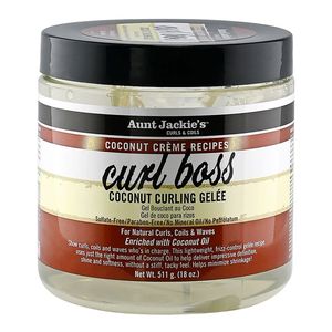 Aunt Jackie's Coconut Creme Curl Boss Curling Gelee. Great For Waves, curls and coils in need of light-weight moisture and definition. Aunt Jackie’s Curl Boss Coconut Curling Gelée is the perfect styling remedy for help achieve soft, bouncy, smooth, hydrated, radiant-looking curls, coils and waves. Great for 1c – 4c textures, wash-n-go styles, and any curly style in need of long lasting moisture. When used properly, and along with other Aunt Jackie’s therapies, Curl Boss can help minimize shrinkage, and won’t weigh hair down, or cause flaking or caking.